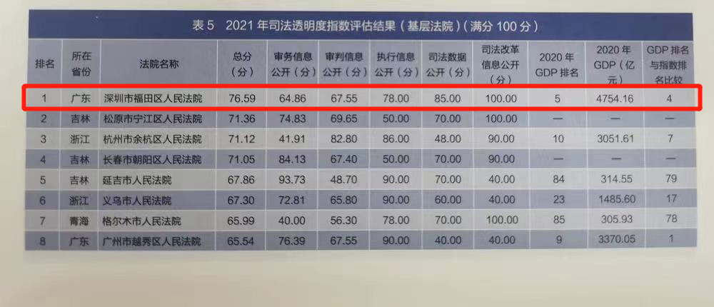 福田法院在2021年度中国司法透明度指数评估中,以76.59分位列全国基层法院第一。