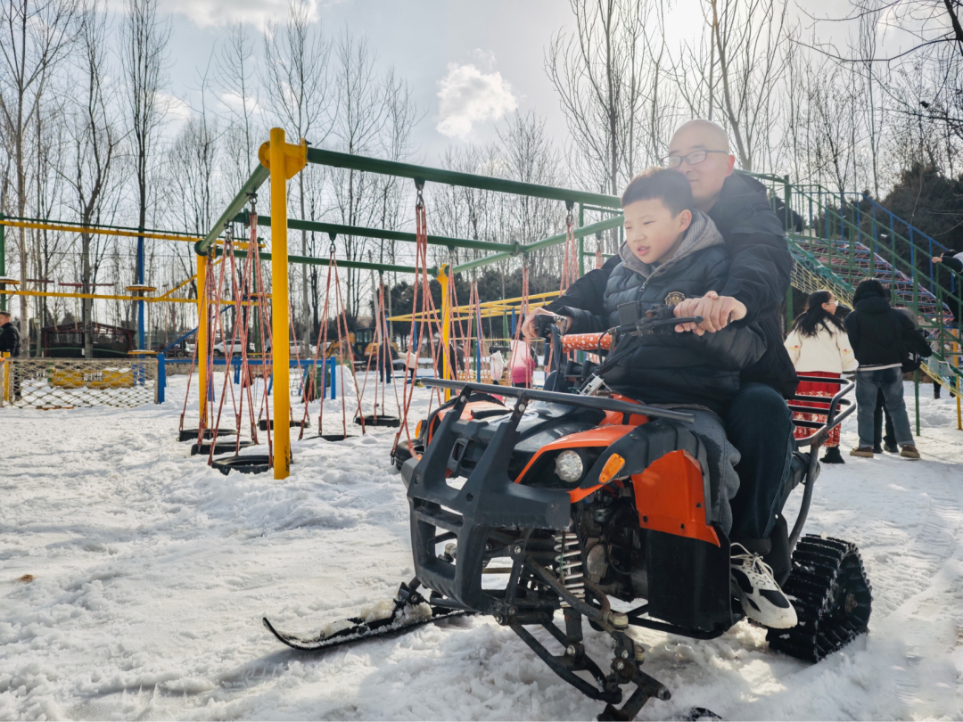 戏雪乐园还开设了雪地摩托车、雪地推车、雪上自行车、雪上冲浪等20余种戏雪项目,可供亲子家庭游玩体验,“太行雪乡”红红的灯笼与白雪木屋相映衬,色彩明朗绚丽,游客游走其间,可赏多姿多彩的雪乡美景。