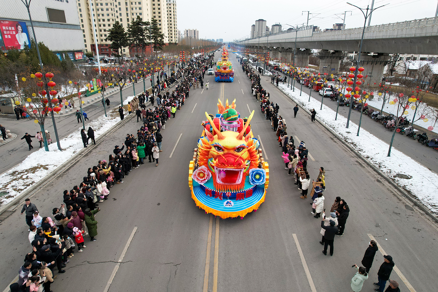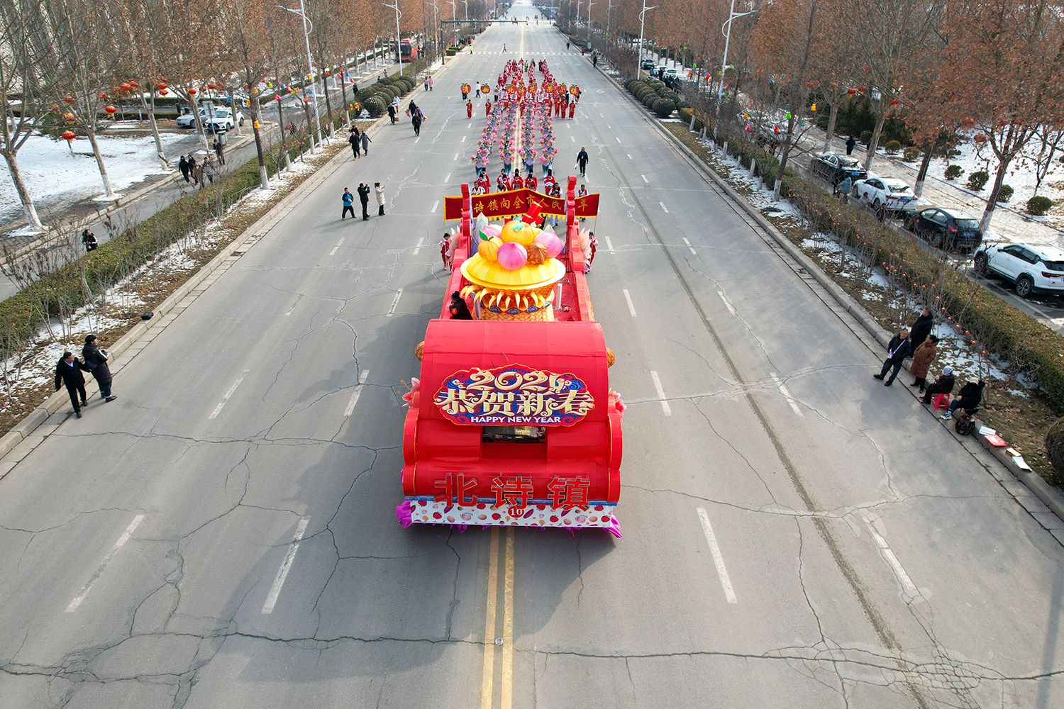 彩车围绕“新春新年新干劲”为主题进行设计并制作。两条巨龙昂首向前,立体玲珑的新春彩灯放置于彩车中央,直径两米的巨型大鼓放置于花车尾部,可谓是:双龙戏珠吉祥年,春回大地万物新。战鼓擂动声雄壮,北城儿女天下先!