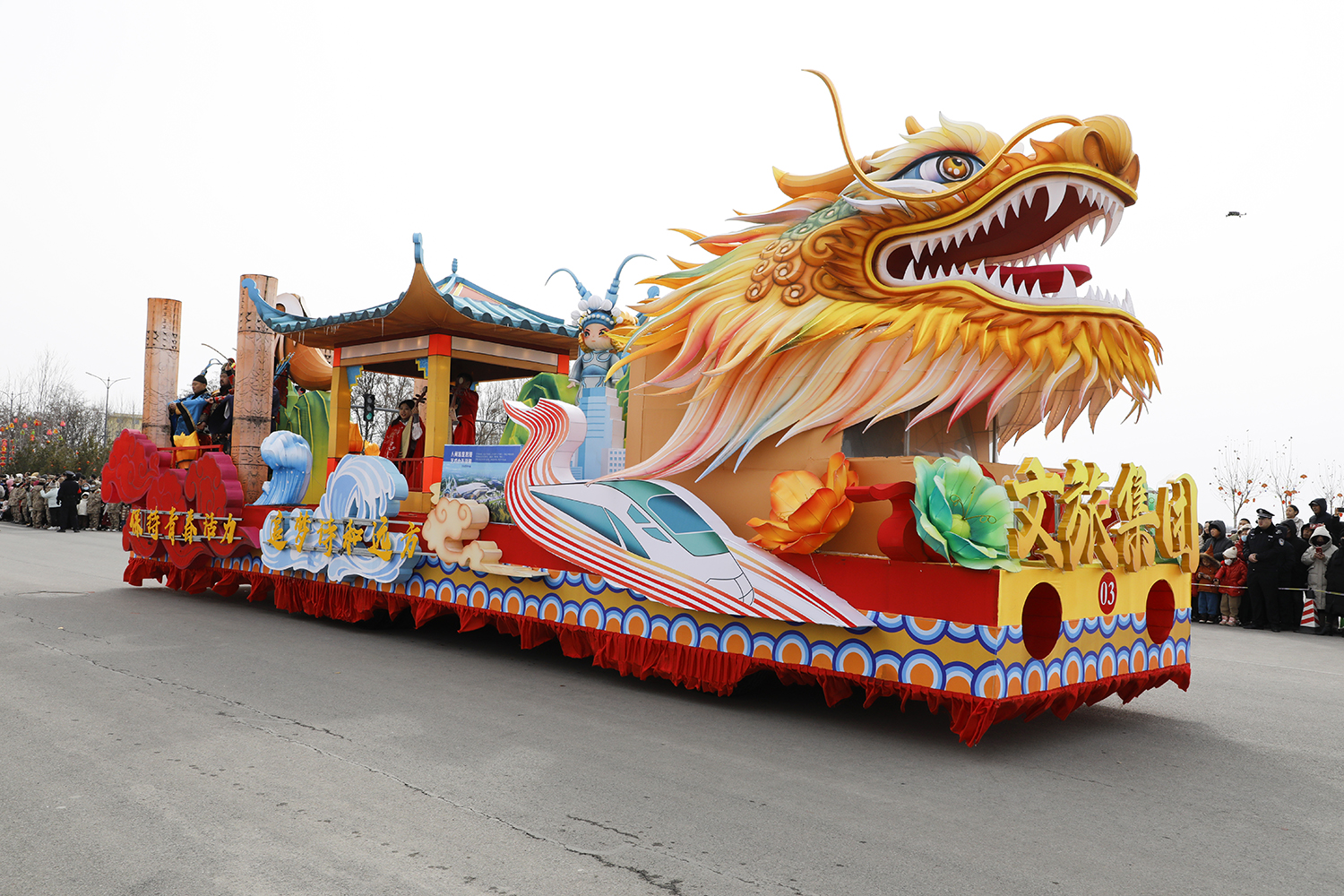 “双龙戏珠 乡村振兴”花车,车头设计有“原村”字样,左右各有一条腾云祥龙攀附,“原村”字样上方是一颗灵动的火珠,象征着原村乡各项事业发展蒸蒸日上,百姓生活红红火火。