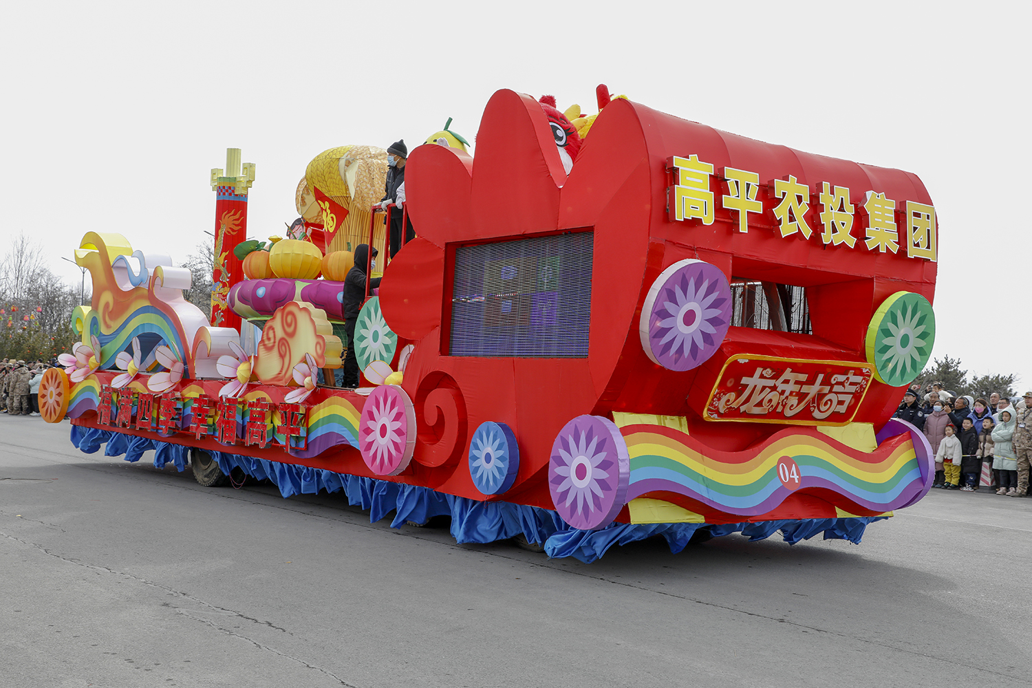 “庆丰年”主题彩车,以古建国保开化寺为元素,融入铁炉贡梨、菊花、辣椒、关山驴等特色产业元素,以别致的造型展现陈区镇党建引领,产业兴旺,集体增收,村民致富的美好寓意。