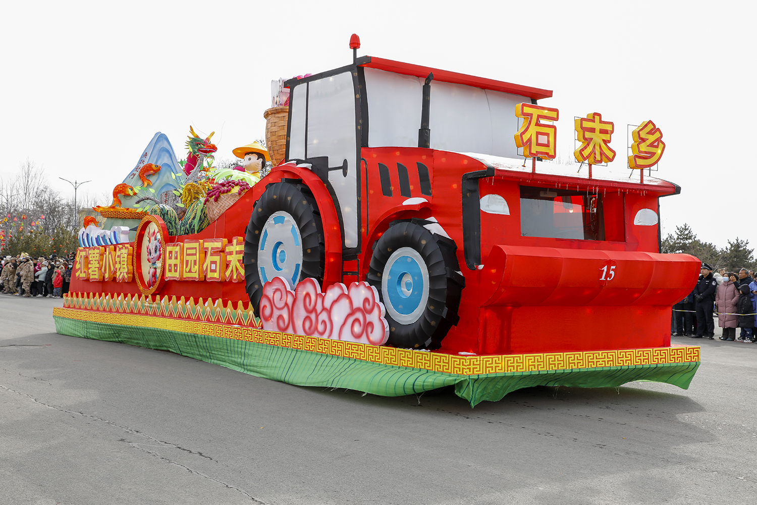 彩车以拖拉机为主体,承载农业产业加速前行,绘制出五谷丰登、农业富民的石末画卷。车头用红薯、小米、种羊特色农产品为元素,展现一派生机盎然的农耕景象。车尾围绕秀丽紫峰山而立,千年酸枣树、国保宣圣庙等独具特色文化品牌,彰显石末润泽万物、传承文明、立德树人的悠久文化。