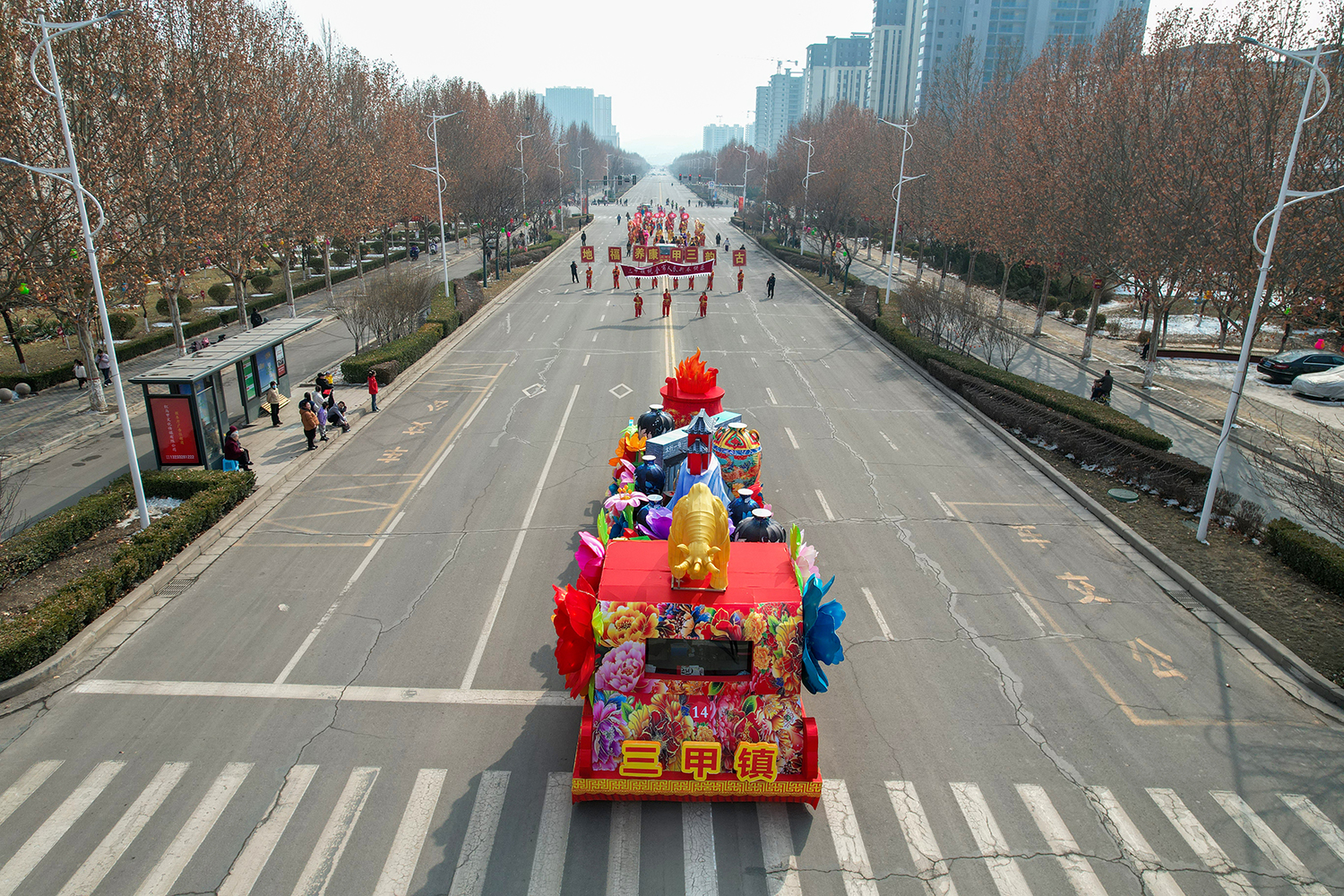 彩车头部是一头“三角金牛”,体现了三甲镇党员干部“为民服务孺子牛、创新发展拓荒牛、艰苦奋斗老黄牛”的三牛精神。整个车身由牡丹、珐华器、三甲鼎、汤王山组成,体现的是三甲镇的“四张名片”,即珐华器、千亩牡丹、冶炼铸造和休闲康养。